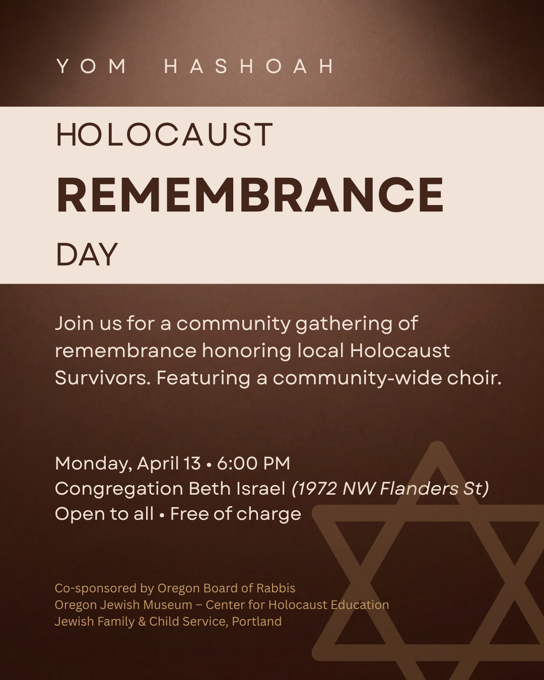 For Holocaust Rememberance Day (Yom HaShoah), the community is gathering at Congregation Beth Israel at 6pm on April 13th for observance. Some of our dear Holocaust Survivor Services clients would like to attend this important event. Can you help get them to it? We are looking for drivres to take them to and from the ~ hour-long event.
